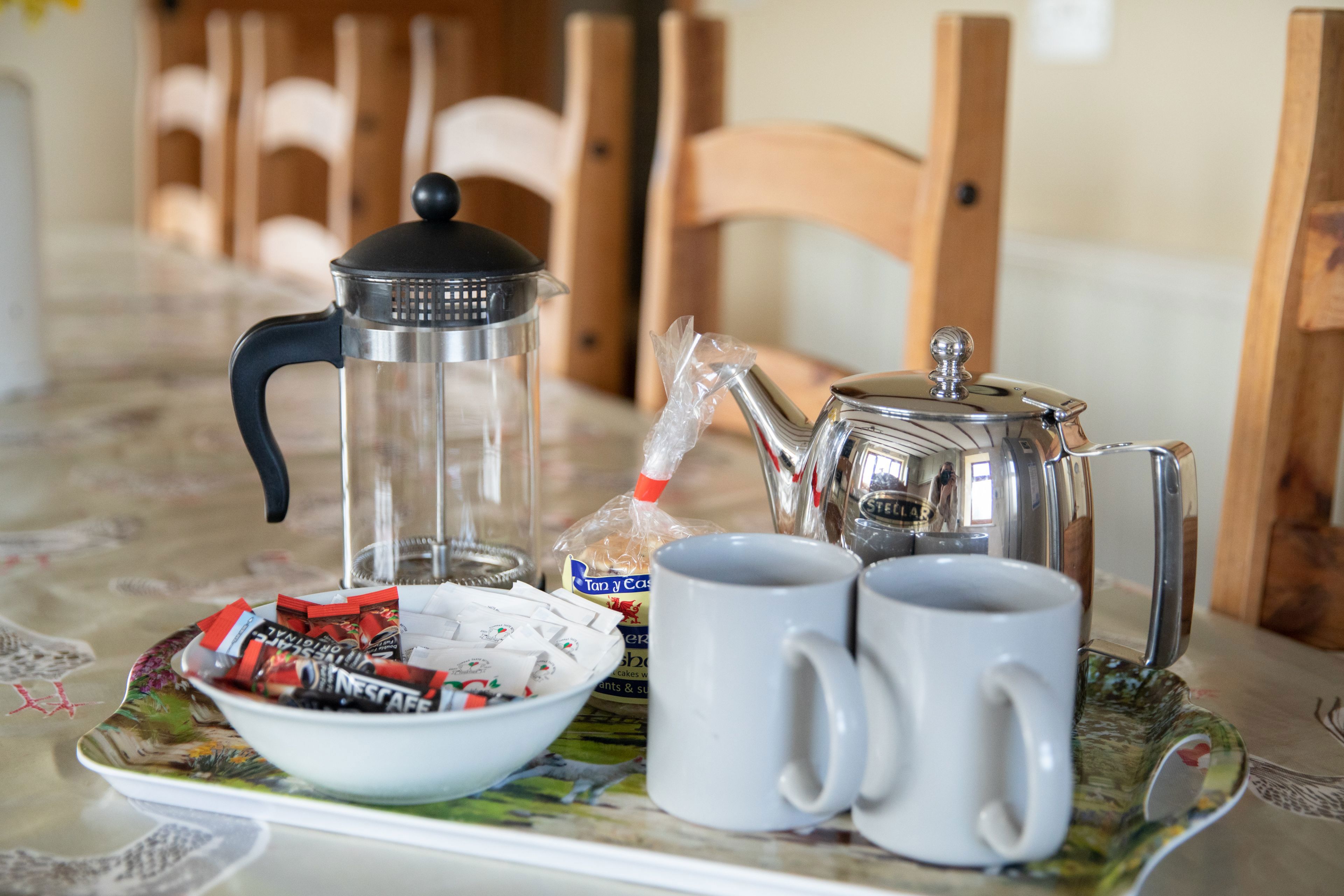 - Tea, coffee, sugar and milk, oil, selection of condiments.