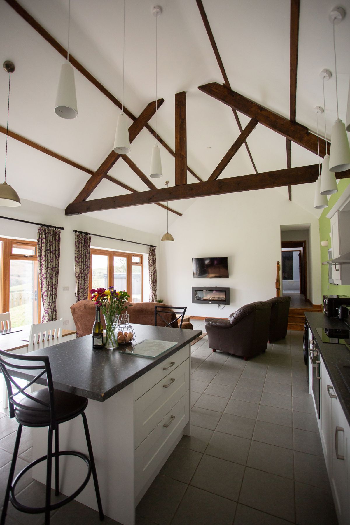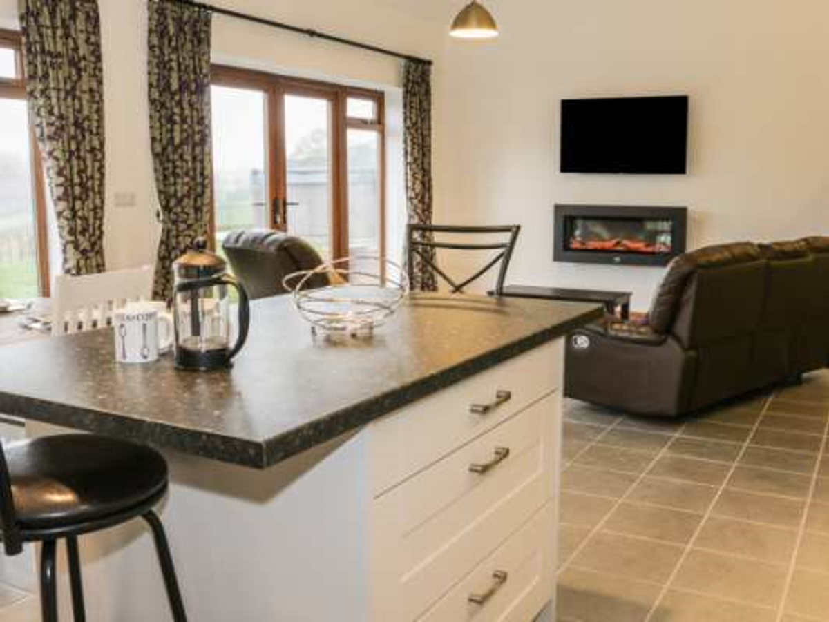 Enter into the open plan living space, with two large french doors to take in the fabulous views of the fields beyond. A large wall mounted smart TV and electric fireplace.and DVD player.
