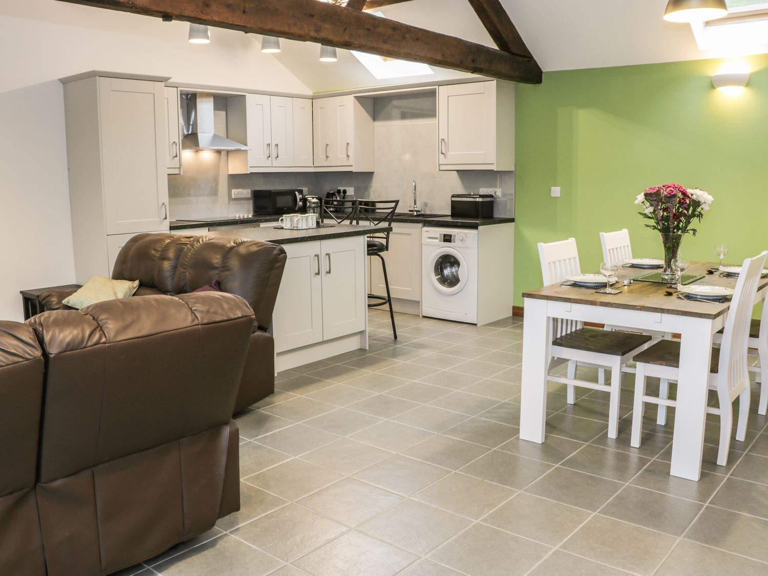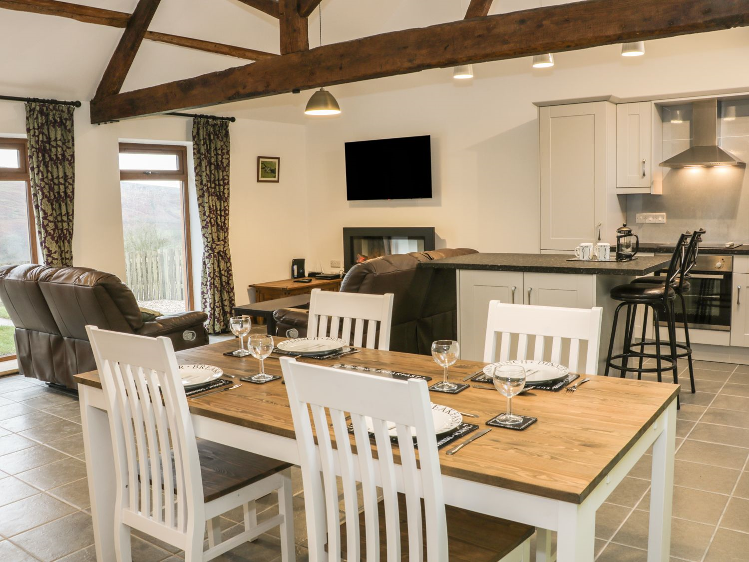 - Open plan living area with kitchen, dining area and sitting area with electric fire