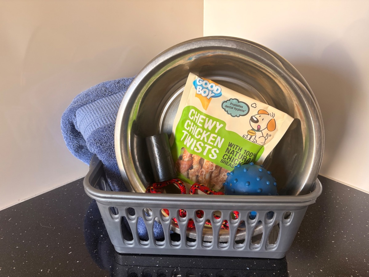 Doggy basket with extras that may have been forgotten are in the farmhouse and barns